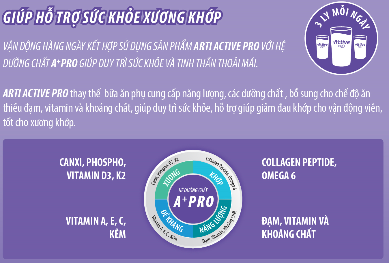 Vận động hàng ngày kết hợp sử dụng sản phẩm Arti Active Pro Với hệ dưỡng chất A+pro giúp duy trì thể trạng.