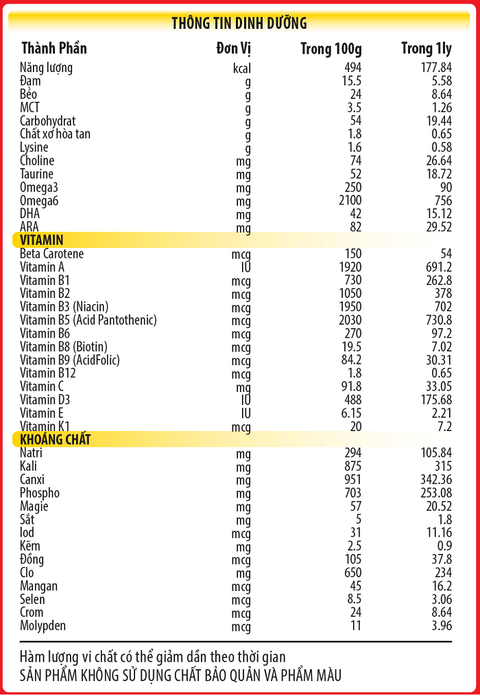 Sản phẩm là sữa công thức pha sẵn trên dây chuyền sản xuất tại Singapore, đóng gói tại Việt Nam. Sản phẩm bổ sung Vitamin, khoáng chất, chất xơ, MCT... cũng như đầy đủ các dưỡng chất cần thiết cho trẻ phát triển như khi sử dụng sữa bột thông thường.