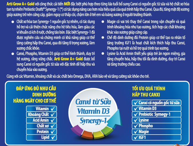 Arti Grow A+ Gold 2 với công thức cải tiến mới đặc biệt phù hợp theo từng lứa tuổi bổ sung Canxi có nguồn gốc từ sữa và hệ chất xơ hòa tan tự nhiên Prebiotic Orafti Synergy – 1(*) có tác dụng nâng cao hơn nữa hiệu quả của quá trình hấp thu Canxi. Qua đó, tăng mật độ xương giúp xương trở nên cứng cáp, giảm nguy cơ thấp còi, chậm lớn trẻ em và loãng xương ở người trưởng thành.